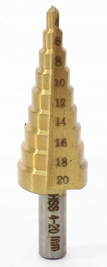 Ступенчатое сверло из быстрорежущей стали с покрытием из титана. Позволяет сверлить идеально круглые отверстия в стали, латуни, меди, алюминии, дереве и пластике.