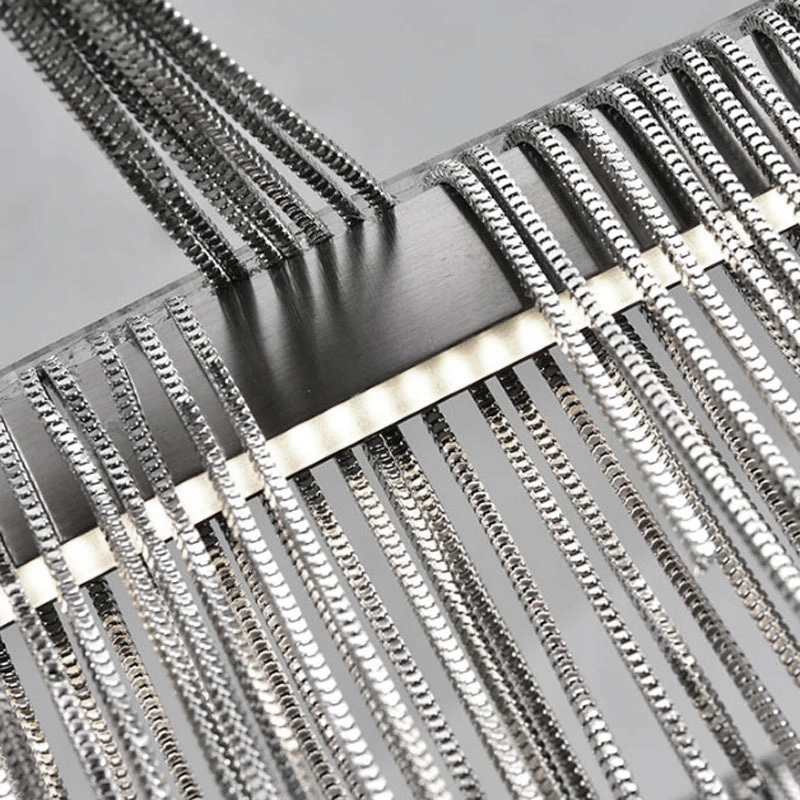 Светильник изготовлен из высококачественного металла, устойчивого к царапинам и механическим повреждениям. Общий характер и элегантность добавляют подвесные металлические цепочки, которые отражают свет и создают красивый эффект.