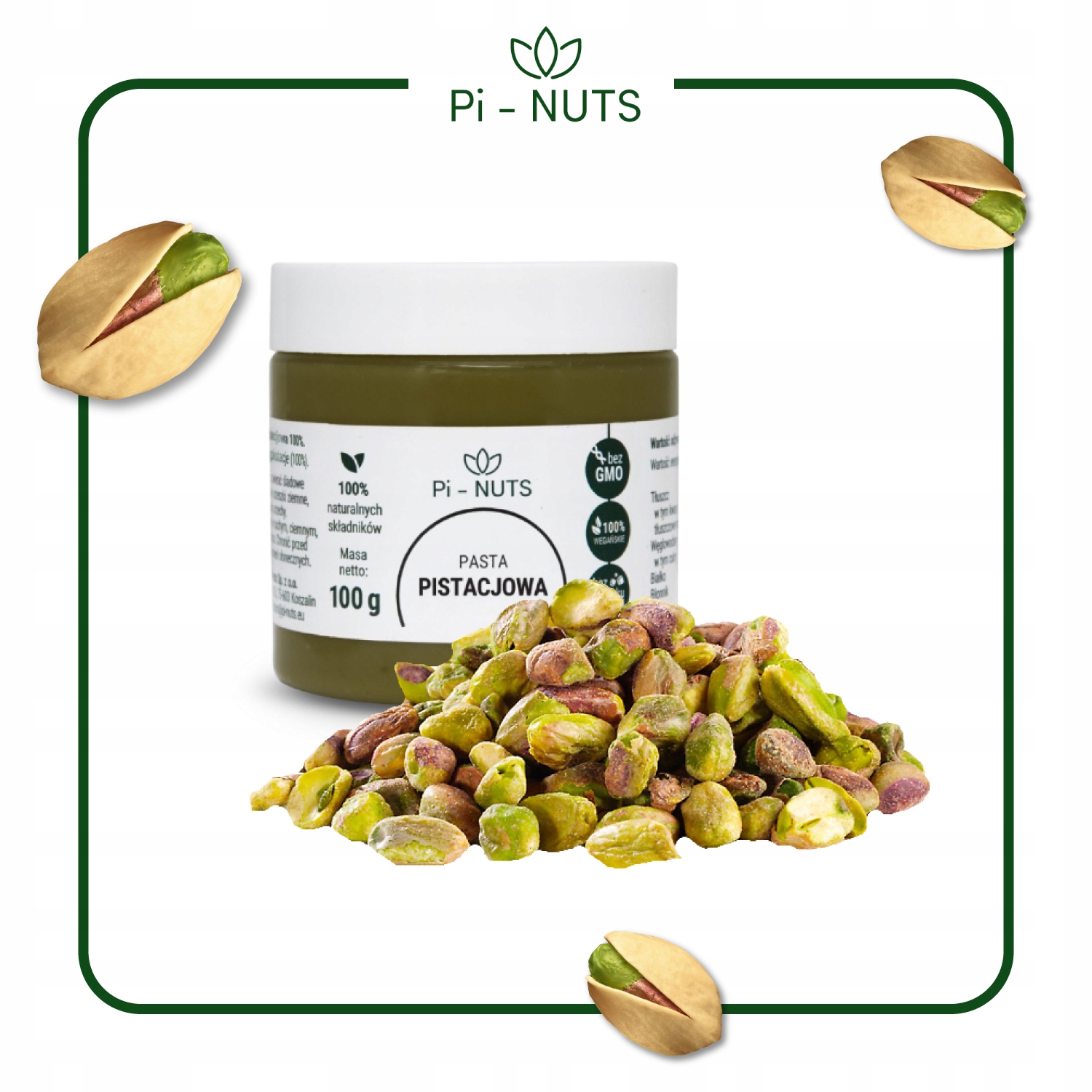 Пистахиновая паста Pi-орехи составляют 100% фисташки. Он не содержит никаких добавок, консервантов или дополнительных веществ. > Продукт, произведенный в Польше