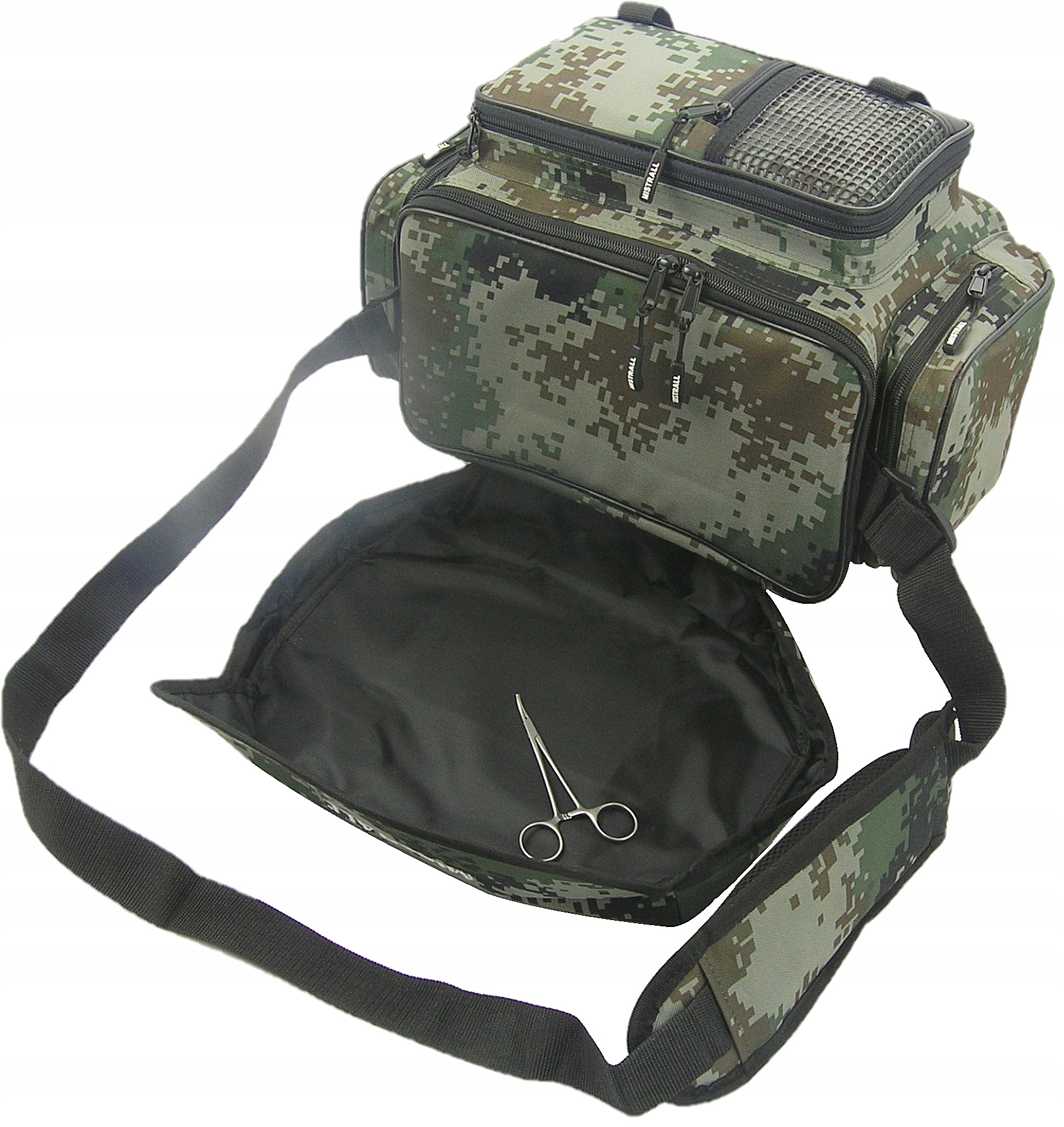 Сумка имеет 3 боковых кармана для небольших плоскогубцев и других аксессуаров, а также большой основной карман для ящиков для приманки.