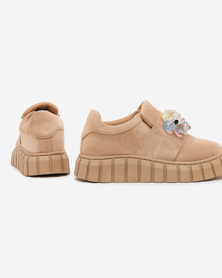 Красивые женские спортивные туфли на толстой подошве. Повседневная модель выполнена из экологической замши, стелька тканевая. На носу украшение из разноцветных камней. Идеальная база для многих повседневных образов!
