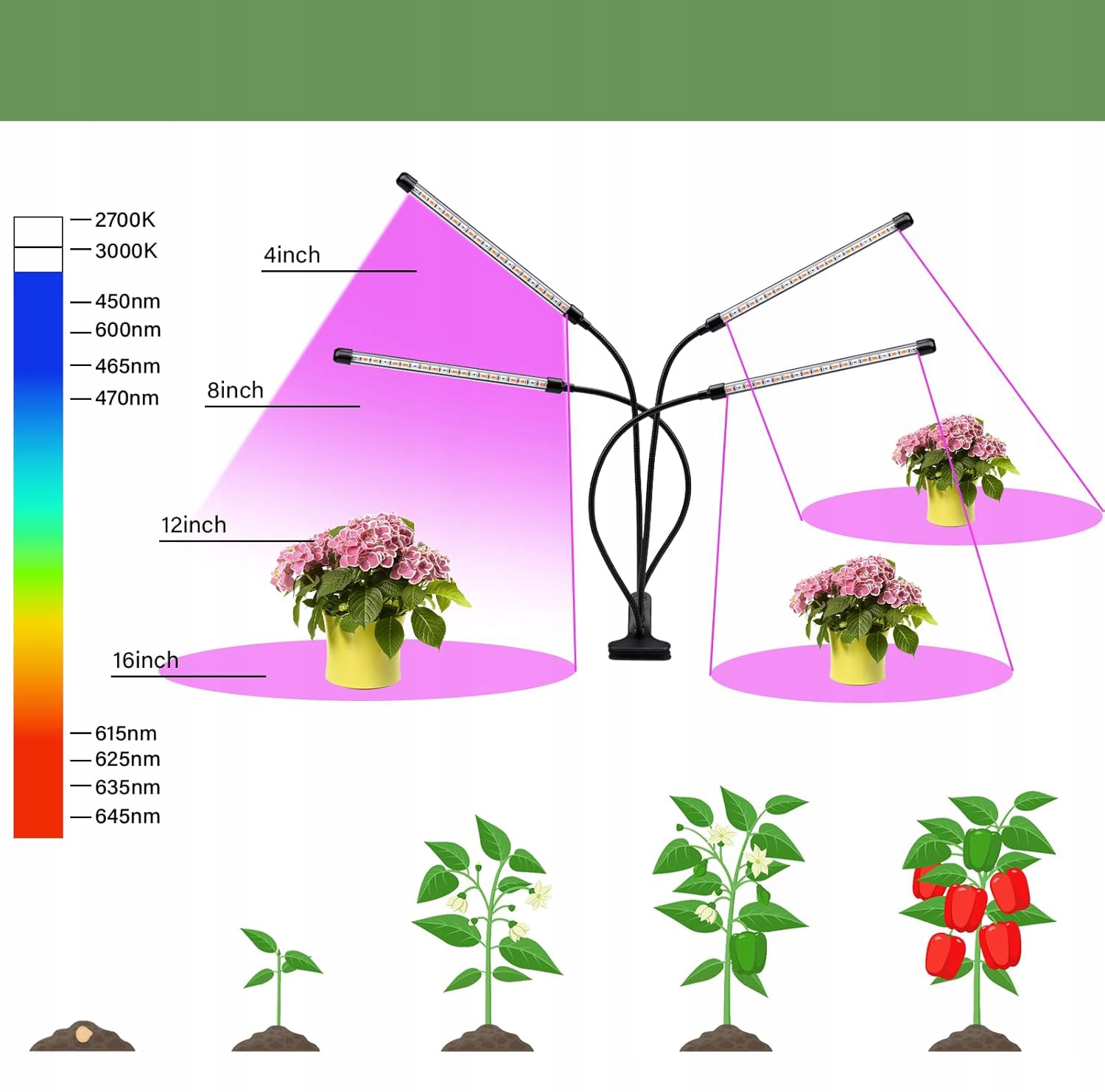 СВІТЛОДІОДНА ЛАМПА ДЛЯ ВИРОЩУВАННЯ РОСЛИН НА 4 ГОЛОВКИ, ЛАМПА ДЛЯ КІМНАТНИХ РОСЛИН З ТАЙМЕРОМ