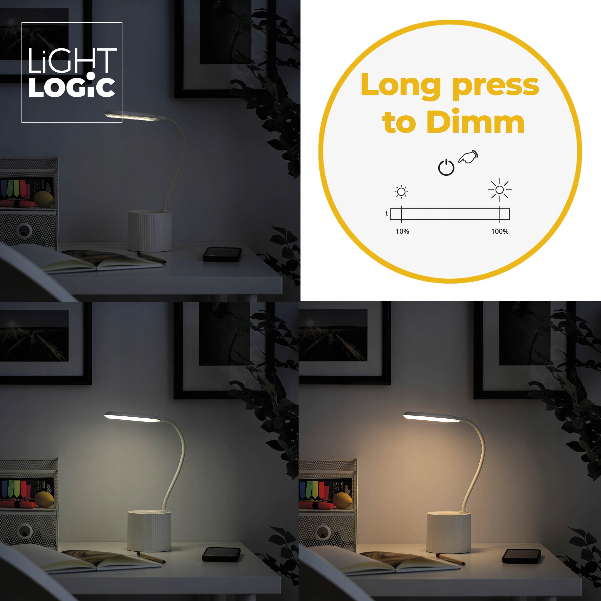 Настольная лампа LL LANKI DIM CCT W белого цвета — это элегантное и функциональное освещение с современным дизайном и светодиодной технологией. Регулируемый и прочный кронштейн позволяет точно направлять свет, что делает его идеальным для работы, учебы и отдыха. Практичный контейнер для аксессуаров помогает поддерживать порядок на столе. Благодаря аккумуляторному питанию светильник мобилен и удобен в использовании, не требует подключения к электросети.