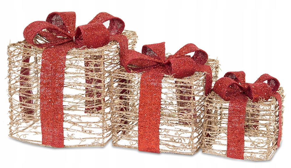 Светодиодный короб из ротанга с красными бантами, золотого цвета. Коробки не открываются. Они идеальны в качестве украшения или подарка под елку. Рождественские украшения создадут необыкновенную атмосферу в обустроенных помещениях и обязательно добавят праздничной атмосферы.