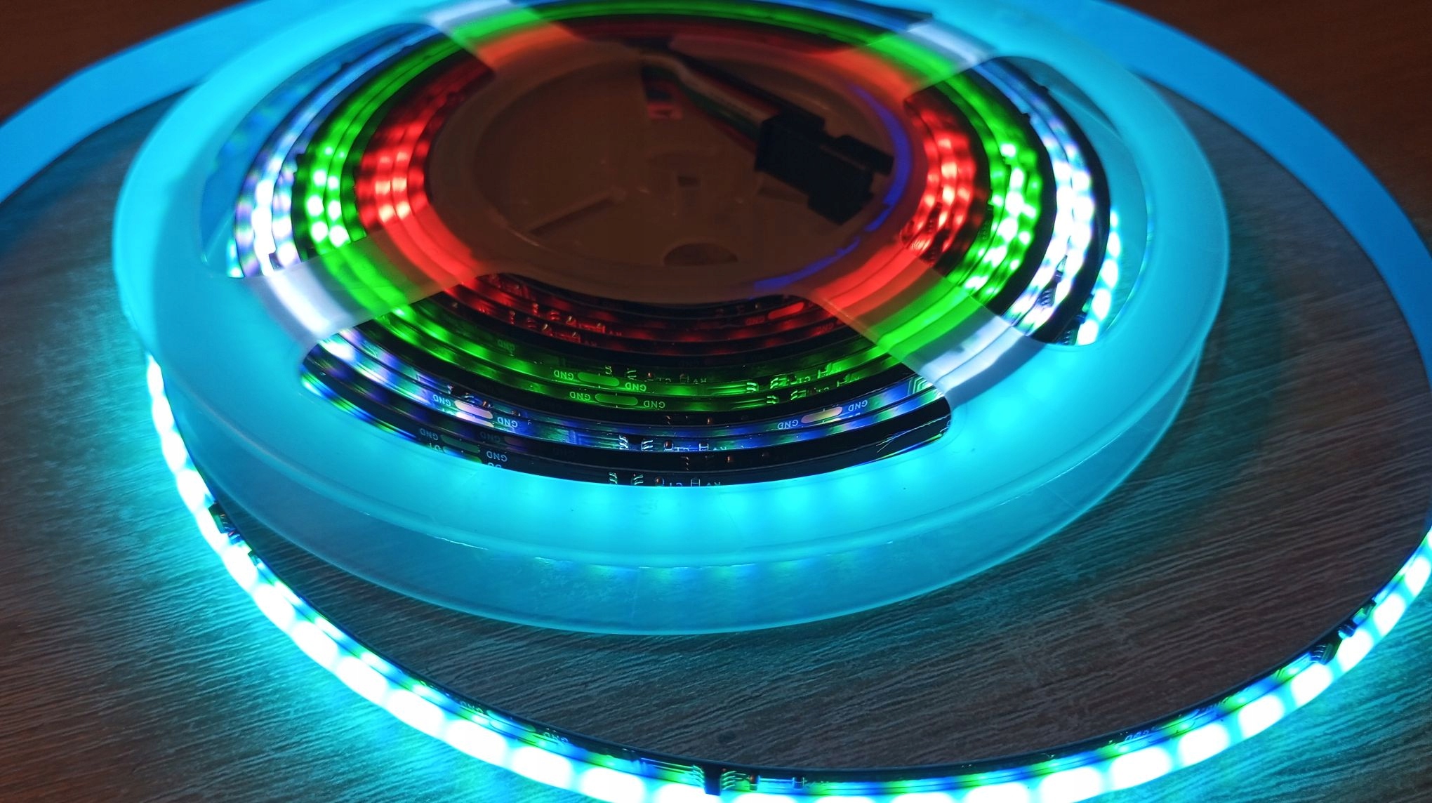 Только такая лента позволяет получить эффект радуги b>, текущий свет, движущаяся точка света, мигает в разных цветах. Кроме того, он может сиять с равномерным цветом по всей длине, а белый получается при одновременном освещении трех основных цветов, как во всех rgb .