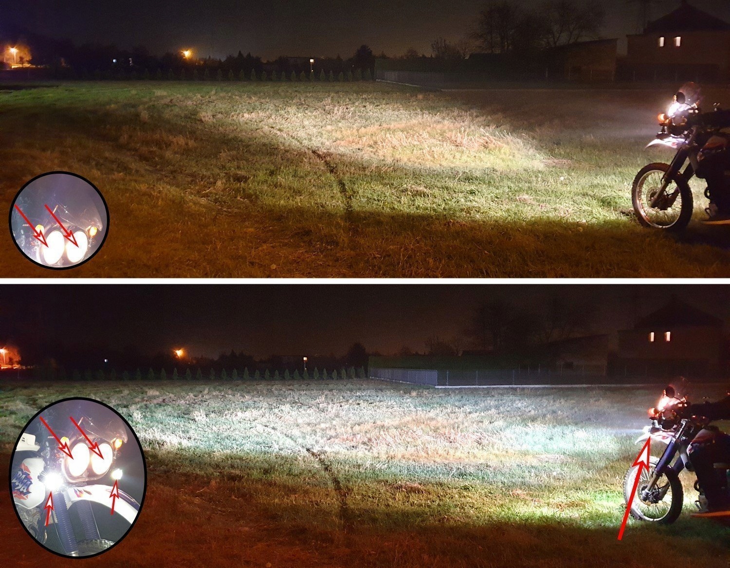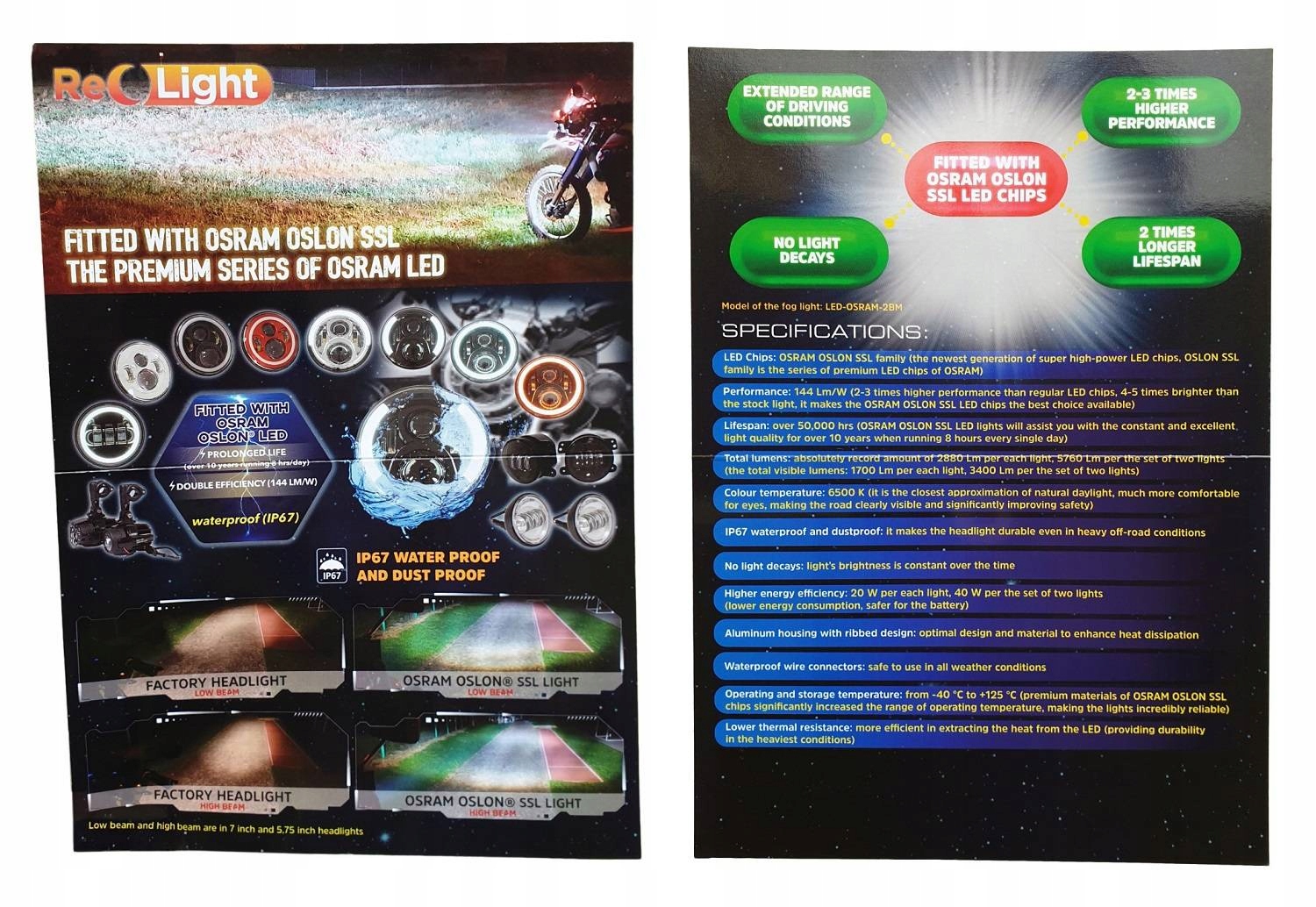 - Значение (количество) излучаемого света на каждой лампе: OK. 2880 лм на лампу, это значение LM, генерируемое каждой лампой, в то время как значение фактического дорожного освещения составляет 1700 лм на лампу (из -за физических факторов). Для сравнения: как стандарт в оригинальных мотоциклетных лампах, эти значения в среднем: 1200 лм для длительного и 700 лм для коротких (то есть для стандартных ламп, значение фактического дорожного освещения составляет около 708 лм для длинных и 413 лм для коротких светильников); Чем больше «LM», тем больше света, значений.