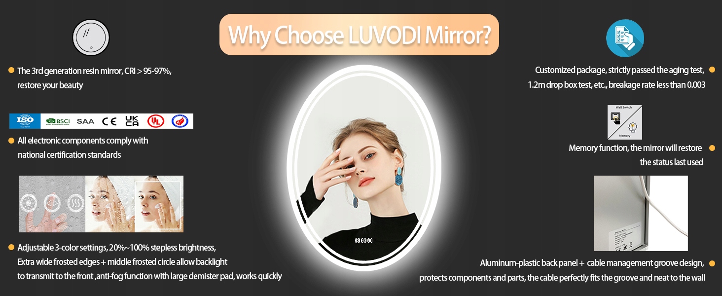 Стильное светодиодное зеркало, которое характеризуется элегантным внешним видом, одобренным многими клиентами, добавляет небольшой блеск и изощренность, создает хорошую атмосферу и восстанавливает ваш район, обеспечивает больше места в ванной комнате. Благодаря светодиодным световым поясам и освещенным светом, которые обеспечивают достаточное освещение для нанесения макияжа, бритья, ухода, подчеркнуть все лицо, чтобы сделать детали макияжа, свет не будет отбрасывать в вас тени, а также сохранит счет за электроэнергию.