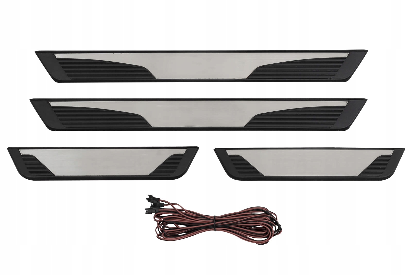 Полоски крепятся на окрашенные части внутренних порогов. Они дополняют внутреннюю линию двери и придают зоне подоконника спортивный и элегантный вид. Данная модель привлекает внимание декоративной светящейся надписью. Благодаря встроенной светодиодной подсветке элемент не только подчеркивает современный стиль автомобиля, но и освещает зону порогов, облегчая посадку и выход из автомобиля.