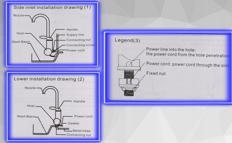 Установка: 2 варианта крепления: Все, что вам нужно сделать, это подключить источник воды и закрепить его винтами. Кабели можно прокладывать над или под столешницей.