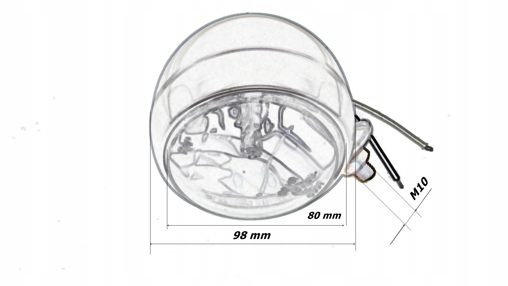 Глубина светильника 97мм, диаметр 98мм, диаметр абажур 80 мм, крепежный винт m10.