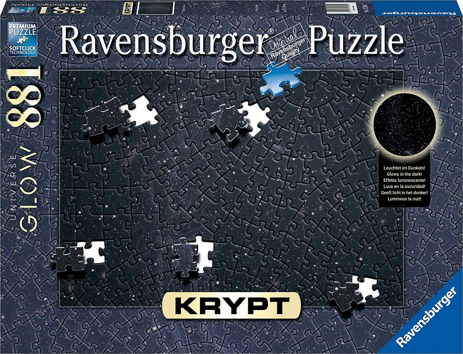 Krypt Cosmic Glow — головоломка с бесконечным космосом и крошечными звездочками, светящимися в темноте. Puzzle Krypt — это серия нетрадиционных головоломок от Ravensburger, которые нестандартно расположены по форме элементов. Размер собранного пазла примерно 70 х 50 см