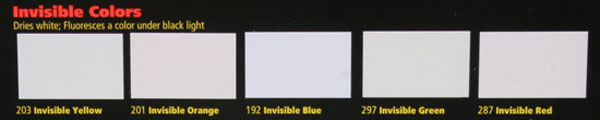 краска доступна в 10 видимых цветах и 6 бесцветных (в дневном свете) "