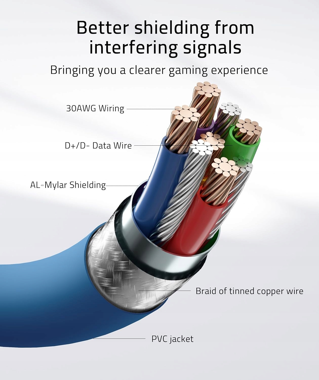 Продолжительность 16 футов (около 5 метров) обеспечивает значительную свободу движения во время игры, не опасаясь случайного отключения или ограничения движений. Прикрепленный ремешок на липучке помогает защитить кабель у очков.