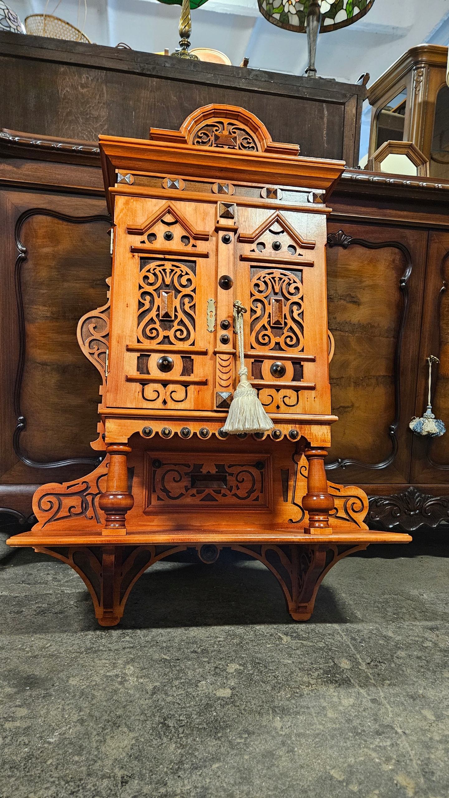 Шкаф, двери, боковины деревянные, резные. Две ручки - крепления. Полка с местом для мелочей внутри.