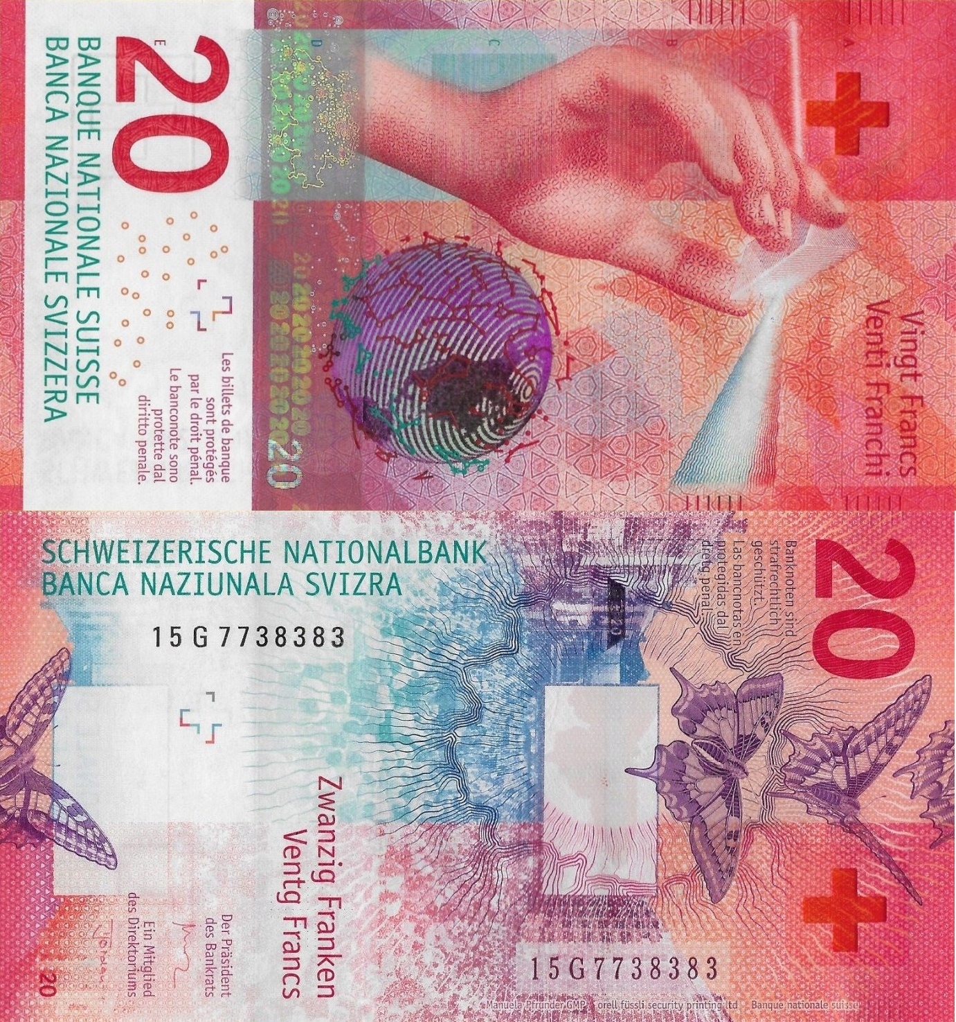 Красивая банкнота номиналом 20 франков из Швейцарии - 2015 года. (P-76a) в абсолютно идеальном банковском состоянии I (UNC).