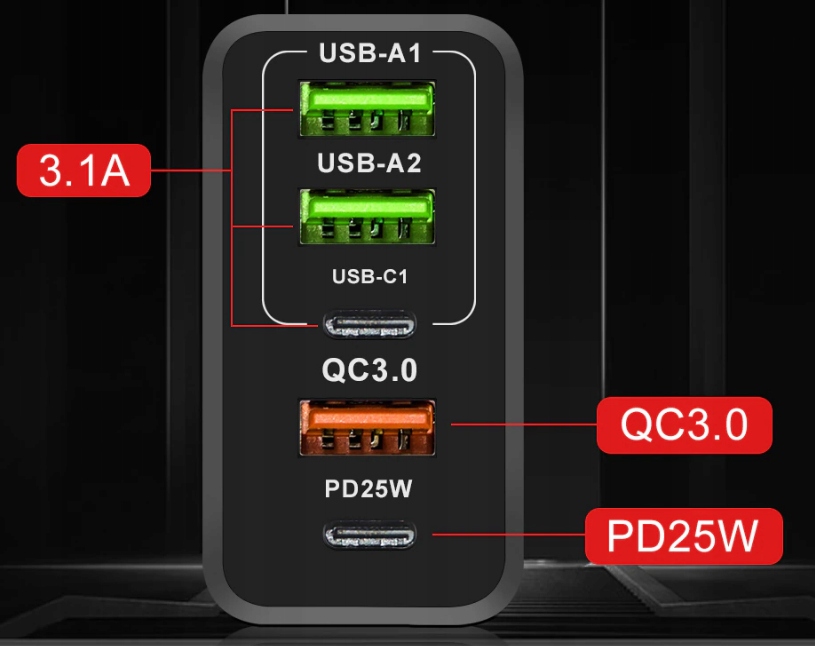 - Зарядное устройство оснащено двумя портами USB-C и двумя портами USB-A, что позволяет заряжать смартфоны, планшеты, ноутбуки и другие электронные устройства одновременно.