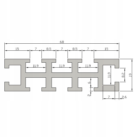 6 канавки, расположенные на более широких сторонах профиля, позволяет использовать аксессуары на основе винта T M6. Две другие канавки в верхней и нижней части рельса позволят винты T M8.