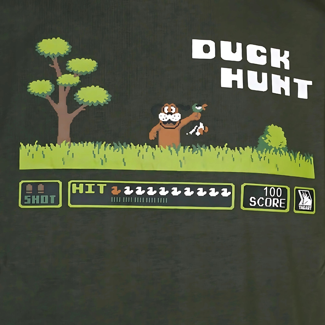 Мужская футболка Duckhunt в зеленом, ярком цвете. Расположенный на передней части Fnt Duckhunt T -For -Fort, отпечаток, относящийся к классической видеоигре, выражает ваш персонаж. Вам понравится футболка, особенно если вы любитель горного туризма, пешеходных поездок, охоты на кустарники или вам просто нравится природа.