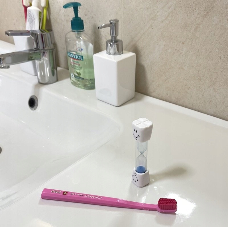 - Забавный гаджет, который высыпает песок за 2-3 минуты, а это столько же, сколько должна длиться чистка зубов.