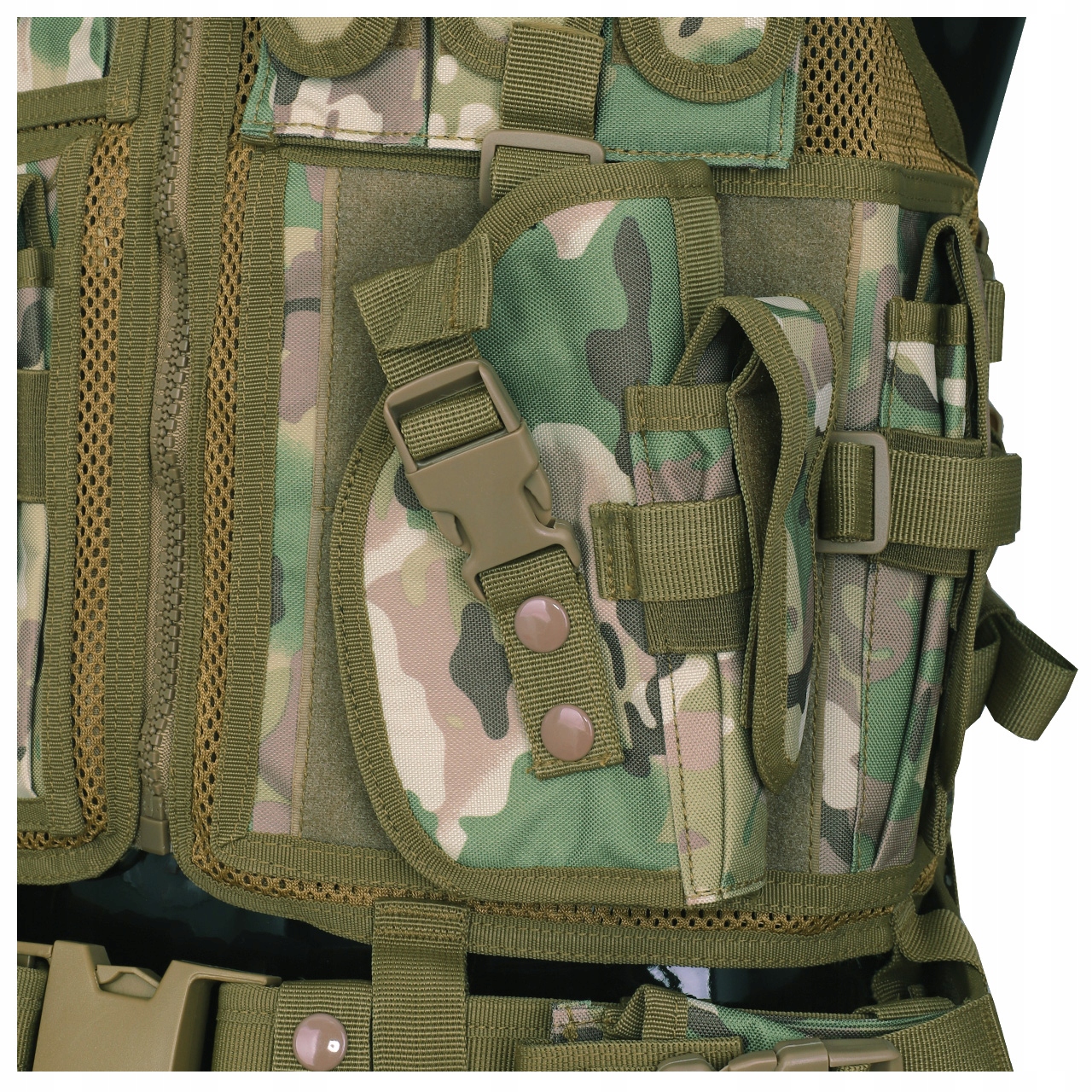 Тактический жилет разделен на две части и застегивается на молнию. На правой стороне расположен карман с органайзером и панелью-липучкой для нашивок и 3 подсумка стандарта STANAG. Ремень над плечом оснащен противоскользящей накладкой для приклада. С левой стороны расположены 4 универсальных подсумка для пистолетных магазинов, кобура для каждой модели пистолета с подсумком для пистолетного магазина и один подсумок стандарта STANAG . Кобура съемная. Все подсумки застегиваются на липучки.