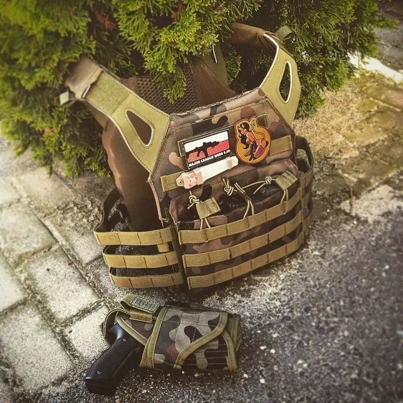 Plate Carrier оснащен встроенным универсальным подсумком, вмещающим три магазина M4/M16, а также без проблем помещается в него магазины АК. Магазины фиксируются резиновыми ручками – такое решение позволяет при необходимости быстро извлекать и менять магазин, одновременно предохраняя его от случайного выпадения. Благодаря модульной системе MOLLE к жилету можно прикрепить ряд дополнительных подсумков и карманов - как на передней, так и на задней панели.