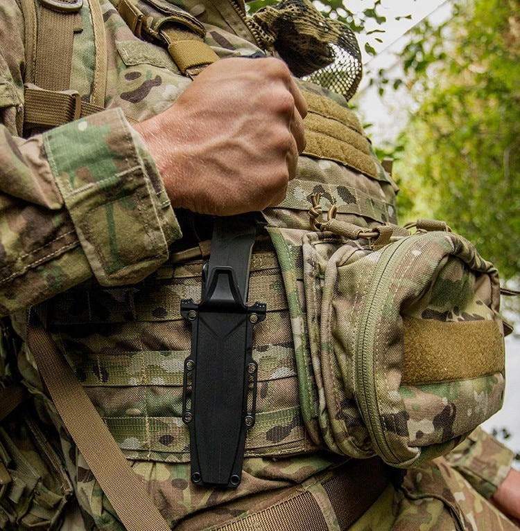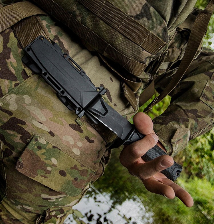 - в комплекте с ножом кобура из прочного пластика с системой крепления Snap-in Molle