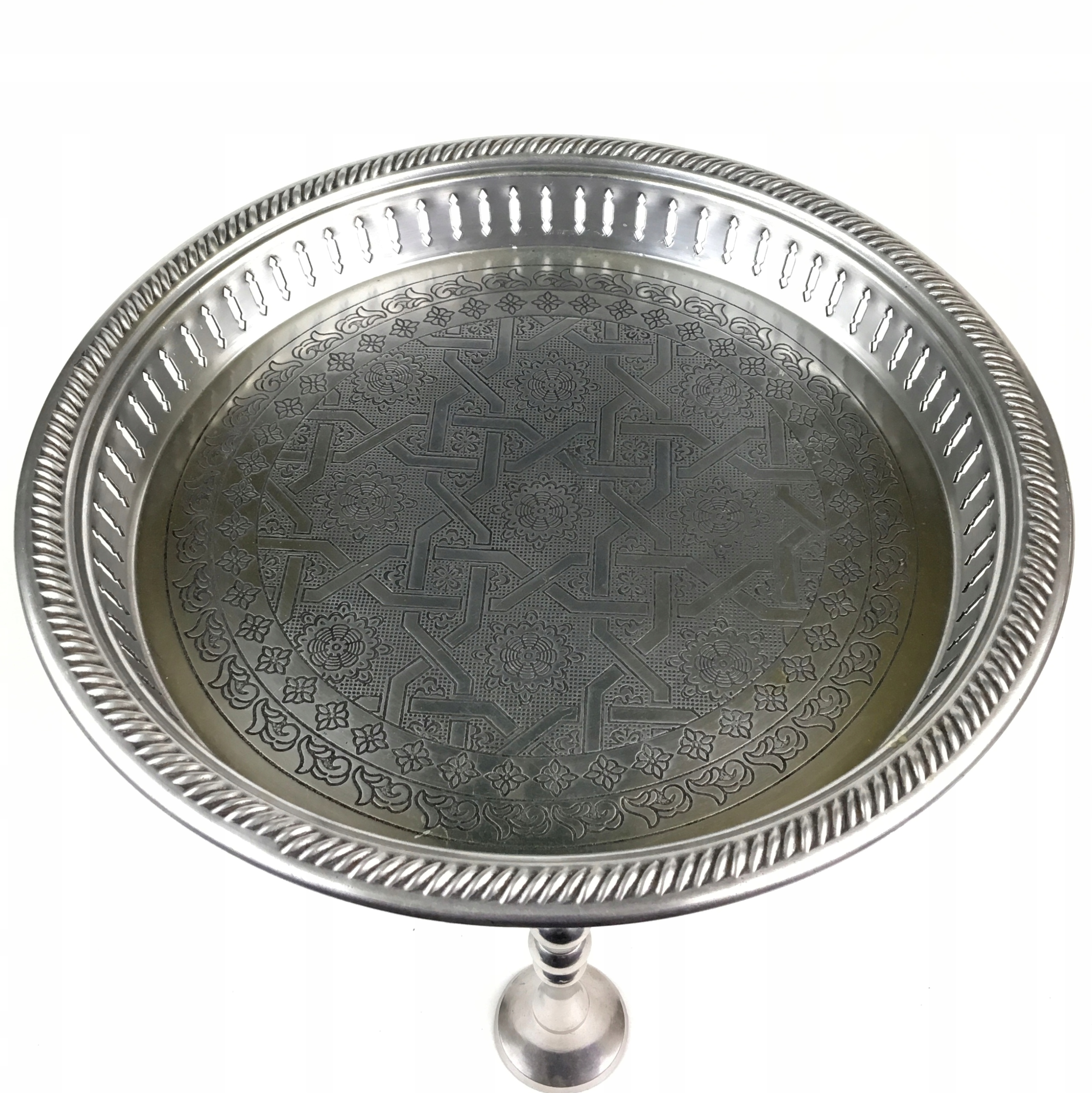 КЕРСТЕН поднос на высоких ножках. Поднос изготовлен на индийской фабрике из полированного и декорированного алюминия вручную. У него ажурные бока и красивое дно с гравировкой и узором. Высокие (съемные) ножки подноса позволяют лучше использовать пространство на столе при подаче блюд.