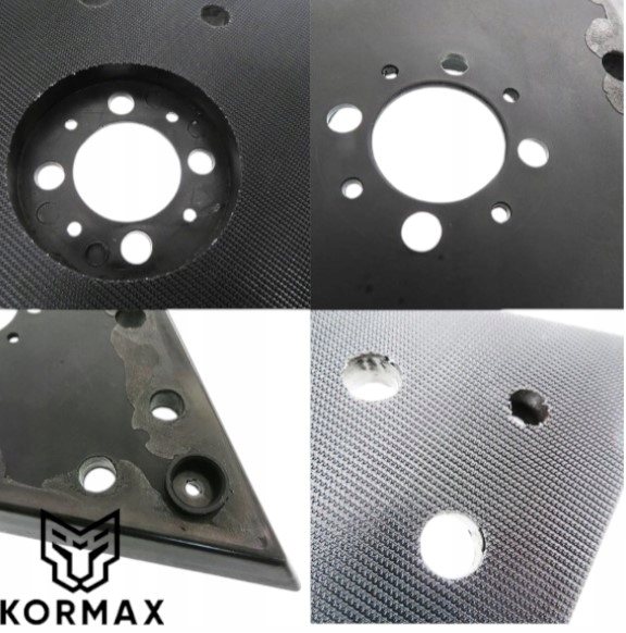 Сплошная, прочная пластина Kormax, оснащенная липучкой для быстрой замены абразивных бумаг и отверстий вентиляции, поддерживающих пыль во время работы.