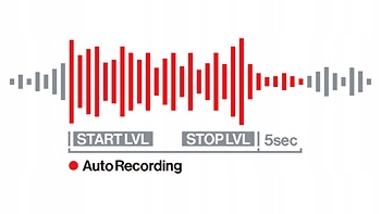 Функция автоматической записи может определять уровень входного аудиосигнала и автоматически начинать запись. А предварительная запись обеспечивает надежную защиту, записывая звук за две секунды до нажатия кнопки записи.