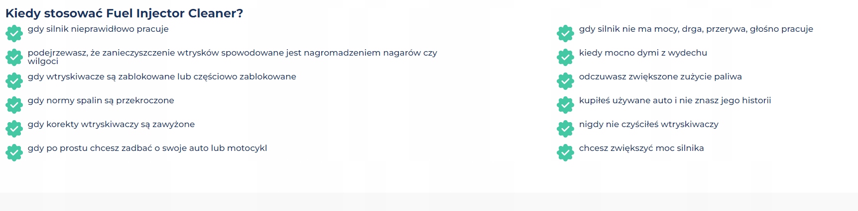 Регулярное достижение после чистки топливных форсунок TEC 2000 (по крайней мере, 2 раза в год) уменьшит или полностью избавиться от сбора влаги вокруг инжекторов. Более того, подготовка к инъекции газа обеспечивает чистоту в цилиндрах, а также предотвращает частичную блокировку инжекторов . Кроме того, это повлияет на более низкое потребление цилиндров, устранит накопление отложений в катализаторе, избавится от неприятного запаха гнилых яиц, поступающих из отложений.