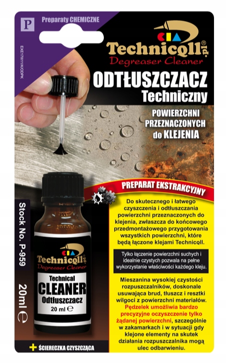 При многих ремонтных работах правильная подготовка поверхности является залогом успеха. Особенно это касается процесса склеивания, поскольку прочность соединения зависит от сцепления (сцепления) между склеиваемыми поверхностями и клеем. Поэтому очень важно тщательно очищать элементы не только от жира и грязи, но и от слабо приставших материалов, например, ржавчины, лакокрасочных покрытий и даже пыли. Для получения клеевых соединений с максимально возможными прочностными параметрами был создан Технический обезжириватель - смесь растворителей очень высокой чистоты.