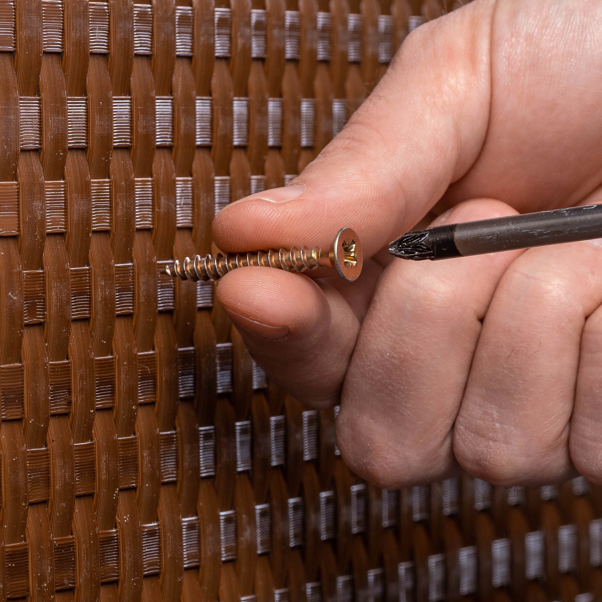 Установка будет более эстетичной, если вставить шуруп или гвоздь под планку техноротанга, которая в дальнейшем будет служить в качестве крышки для головки шурупа/гвоздя.