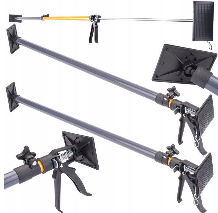 <ул>Опора будет использоваться при монтаже потолочной/настенной плитки (гипсокартона) под неудобным углом или при ремонте склеенных поверхностей. Телескопическая функция позволяет регулировать высоту, а наклоняемые прижимные пластины обеспечивают устойчивое крепление.