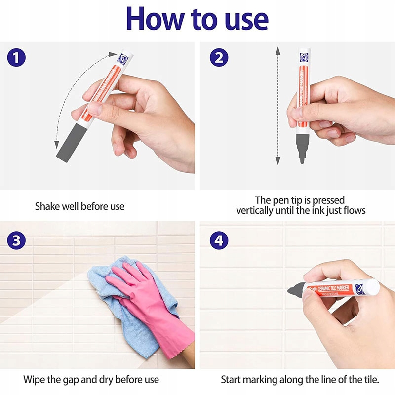2. Белая плиточная перо соответствует требованиям к ремонту различного промежутка плитки. · перед использованием, встряхните ручку с белыми соединениями несколько раз, а затем нажмите кончик ручки, пока чернила не протечет.