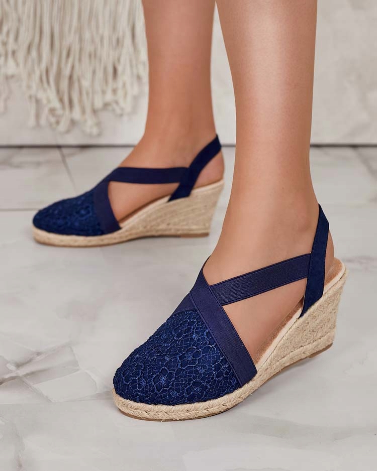 Женские босоножки-эспадрилья на танкетке выполнены из ткани, декорированной кружевом, стелька - из экологической кожи. Туфли-слипоны на резинках. Обязательно в этом сезоне!