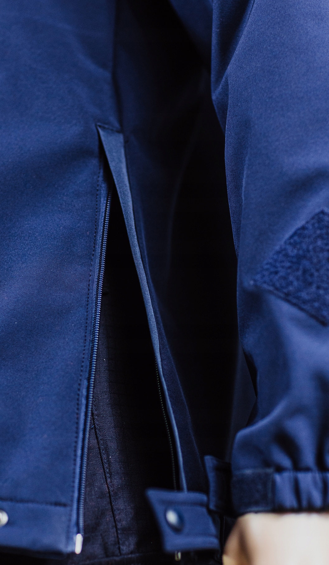 Куртка застегивается на брызгозащищенную застежку | водонепроницаемая двухмашинная молния, обеспечивающая двустороннее застегивание и расстегивание, с удлиненной складкой на воротнике, защищающей подбородок пользователя. Дополнительно молния внизу прикрыта складкой. Край воротника воротника-стойки отделан сложенной флисовой тканью, обеспечивающей приятный контакт лица пользователя с воротником куртки. Куртка имеет 4 внешних кармана (2 косых кармана спереди на молнии и один карман на плечах). Кроме того, в куртку вшиты боковые молнии, обеспечивающие легкий доступ к оружию или другим предметам, прикрепленным к поясу.