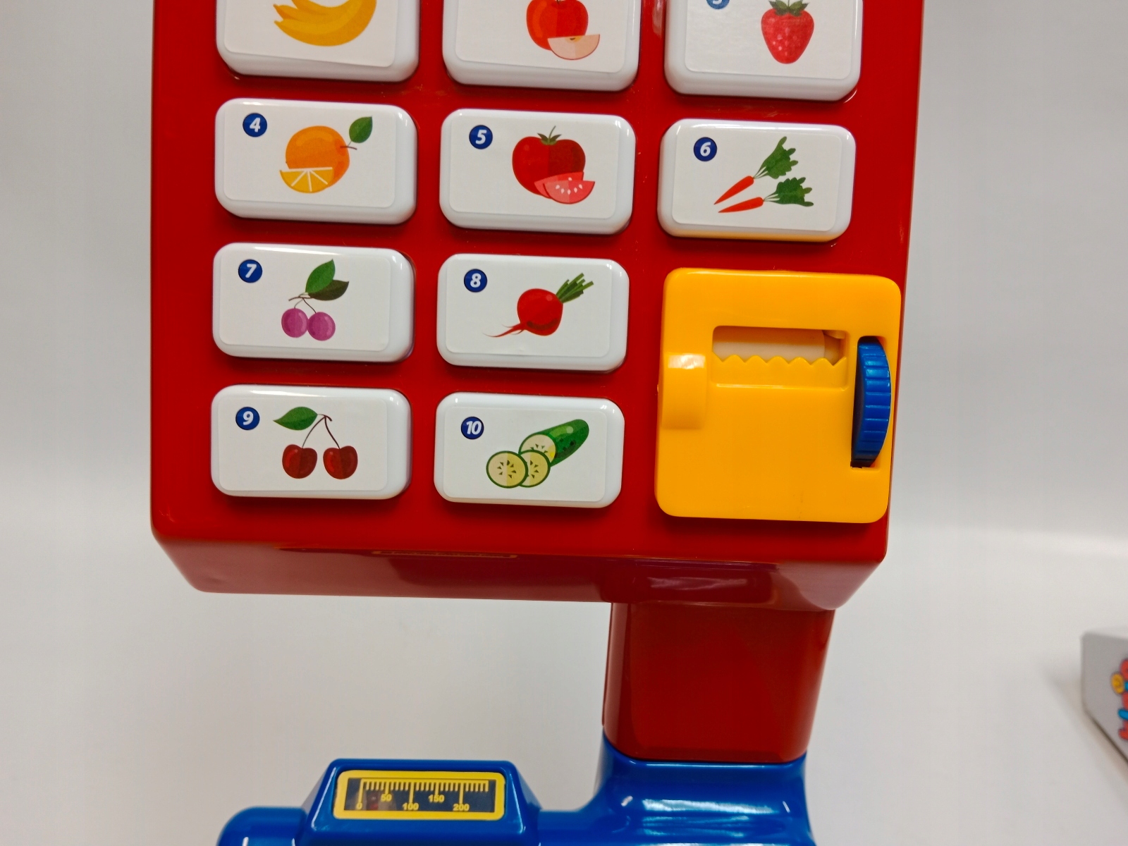 Для правильного управления овощехранилищем необходимы весы! Почему? Потому что это очень весело! Как только груши, яблоки, бананы или сыр и колбасы помещаются на весы, поднос опускается. Теперь мелкие покупатели или занятые продавцы могут нажать на символ фрукта или овоща и повернуть ручку, и на дисплее появится сумма к оплате.