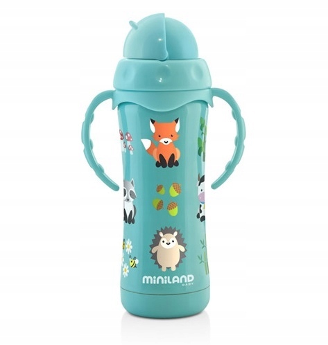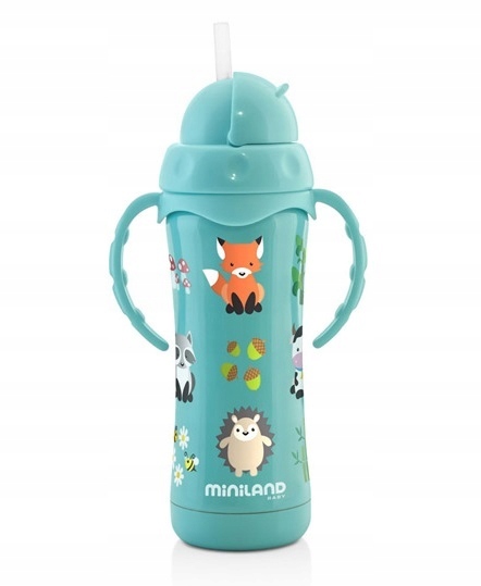 Металлическая и бирюзовая отделка Бутылка и забавные изображения животных привлекают детей.