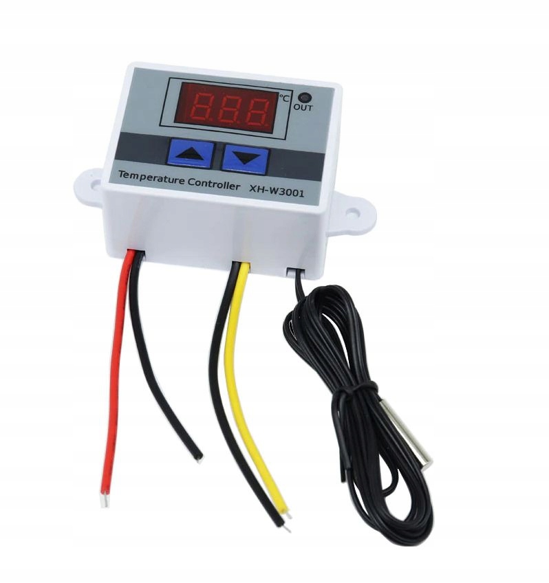 Универсальный регулятор температуры (термометр, термостат) со светодиодным дисплеем, релейным выходом и функцией нагрева/ охлаждение. Корпус с ручками облегчает установку на плате или передней панели поддерживаемого устройства. О включении реле сигнализирует загорание светодиода «OUT» рядом с дисплеем. Диапазон измерения и регулировки от -50°С до 110°С +/-0,1°С. Настройки производятся с помощью 2 кнопок: стрелка вверх и стрелка вниз. При использовании длительных циклов переключения (например, обогревателей емкостью в несколько сотен литров) при высоком токе (более 5 А) рекомендуется использовать внешний контактор с соответствующим высоким током нагрузки.