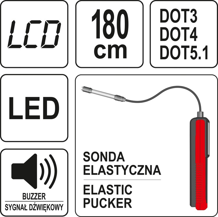 - Гибкий зонд на кабеле длиной 180 см обеспечивает удобный доступ к бачкам с тормозной жидкостью