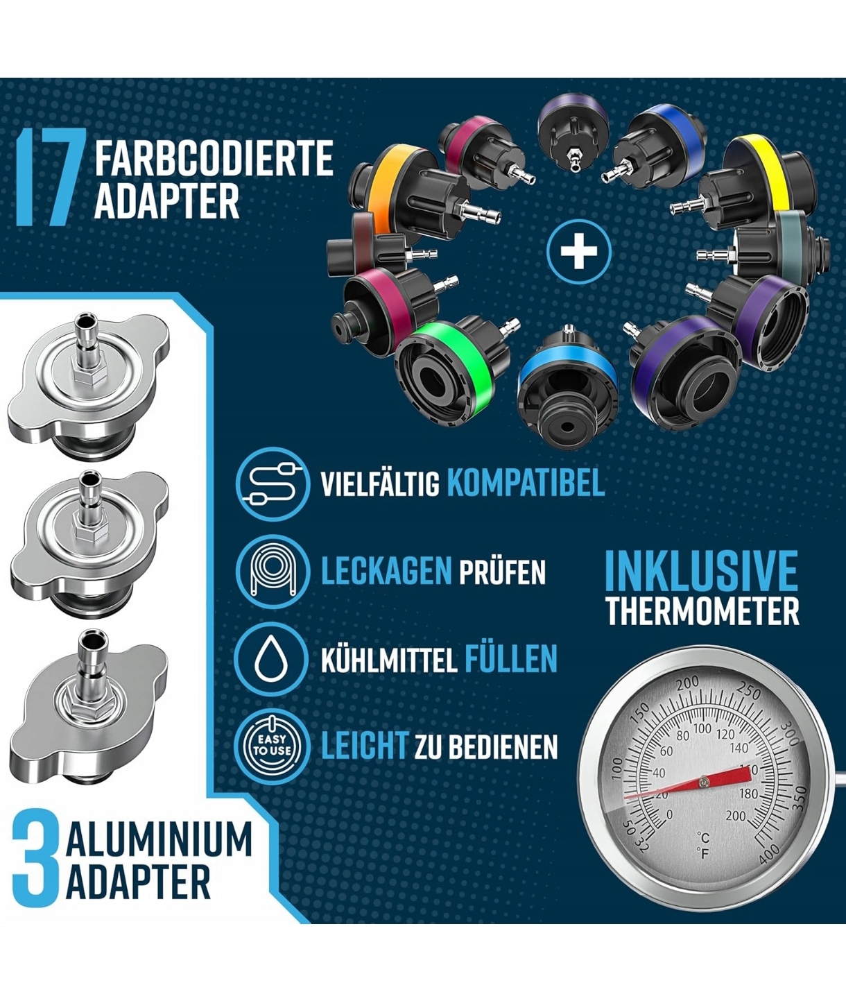 Благодаря набору адаптеров , соответствующих большинству пассажирских и транспортных средств, набор чрезвычайно универсален. Прозрачные шланги позволяют вам контролировать поток жидкости и устранять пузырьки воздуха, что увеличивает вентиляцию. Кроме того, набор включает в себя термометр , который позволяет отслеживать температуру охлаждающей жидкости - это ключ к поддержанию системы в идеальном состоянии.