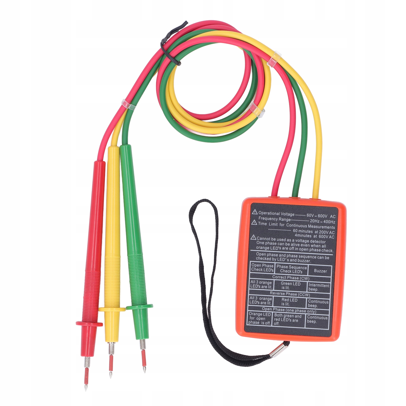 Функция: 1. Простая работа: просто подключите хорошо изолированные вспомогательные зажимы, содержащиеся в устройстве к тестируемой 3-фазной схеме, и устройство будет указывать на наличие фазового разрыва и фазового порядка с использованием светодиодов и зуммера.