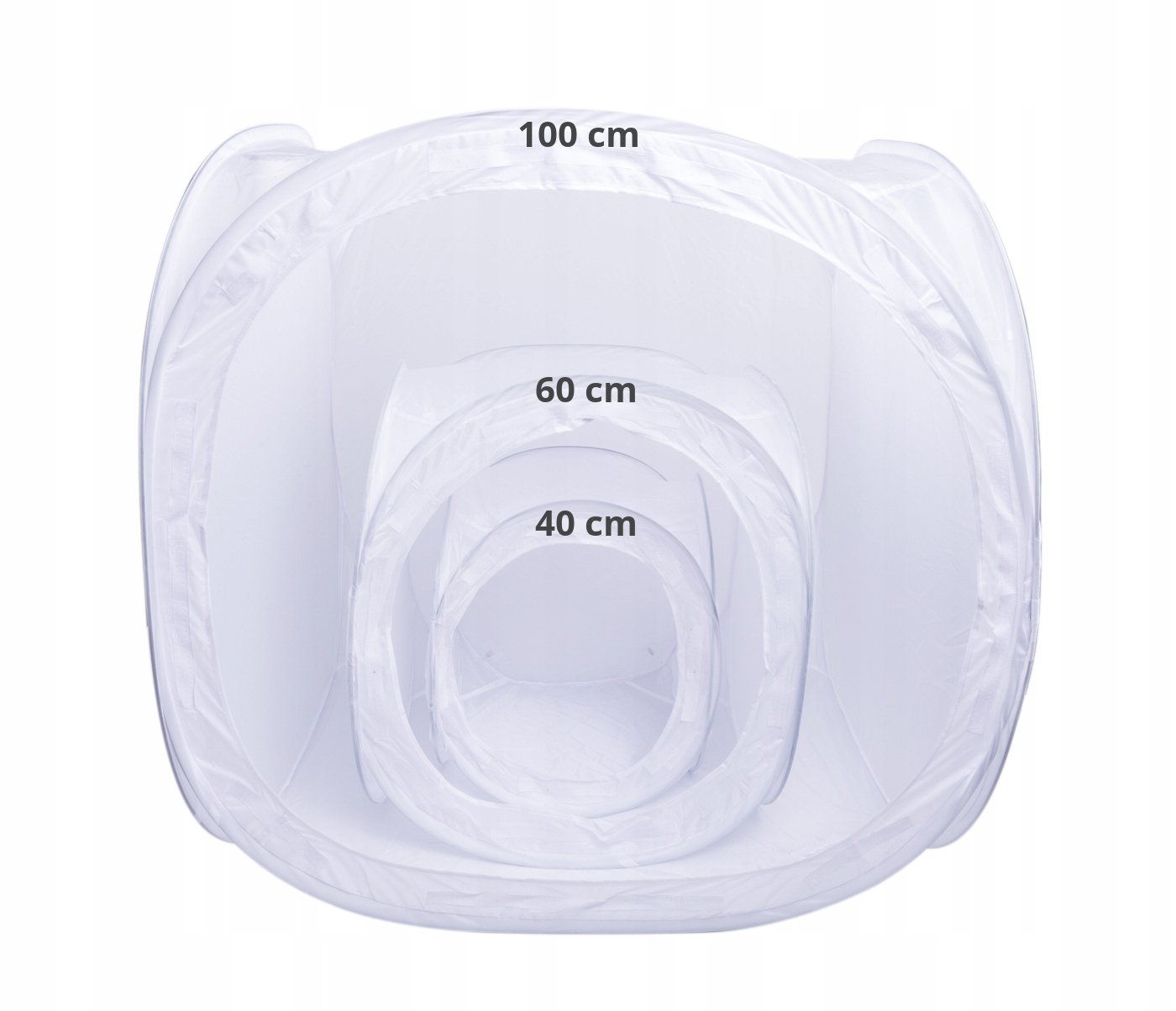 Палатка складывается восьмеркой, так же, как складываются фотожалюзи. Благодаря этому эксплуатация ее очень проста и быстра, а при транспортировке или хранении палатка занимает очень мало места. . Используемый материал идентичен тому, который используется в профессиональных софтбоксах, что гарантирует высокую дисперсию света по отношению к его коэффициенту пропускания. Бестеневая палатка обеспечивает равномерное рассеивание света как от постоянного, так и от мигающего освещения (репортерские/студийные лампы).