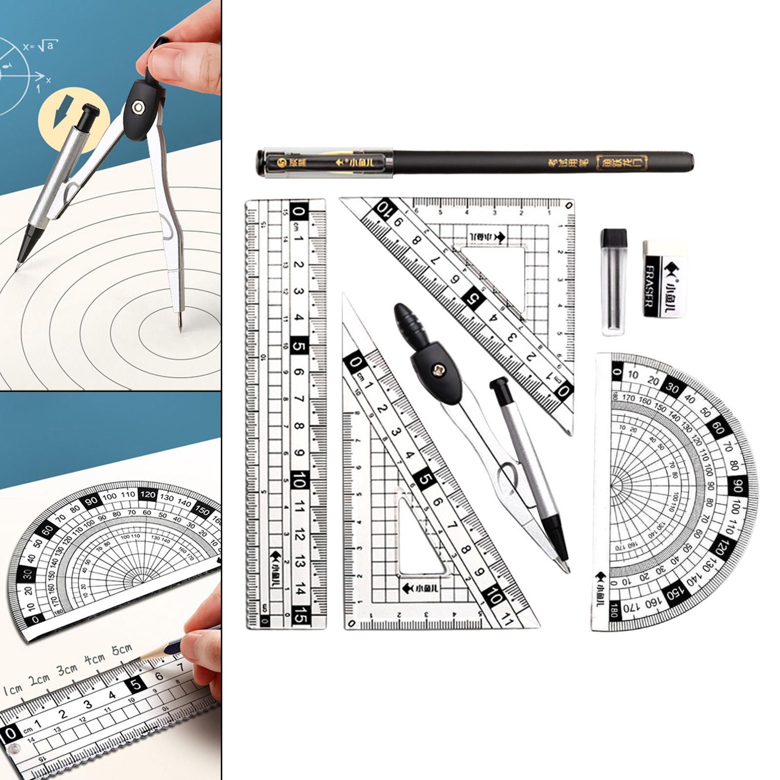 Содержание упаковки: 1 Eraser, 1 Compass, 1 Цирковая вставка (0,7 мм), 1 ручка, 1 прямая линия (15 см), 1 треугольный правитель (), 1 треугольный правитель (60 градусов).