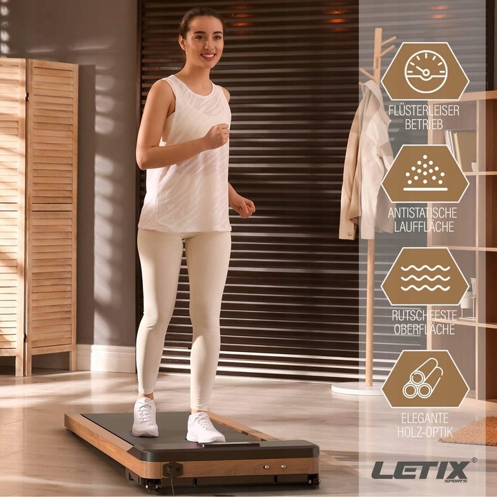- идеальная беговая дорожка для начинающих и офисных спортсменов. Оснащенная тихим электрическим двигателем, беговая дорожка ускоряется до 6 км/ч. Поверхность по вибрации бега защищает колени и кубики во время тренировки. ЖК -дисплей предоставляет информацию о данных, относящихся к обучению, например, время, скорость и потребление калорий. На беговой дорожке есть 12 учебных программ, которые имитируют различные разделы маршрута и соответствующим образом регулируют скорость. Благодаря очень плоской конструкции (всего 12 см) беговая дорожка может быть легко спрятана под кроватью, диваном или двери. Благодаря интегрированным колесам «Deskwalk360» вы можете легко перемещаться.