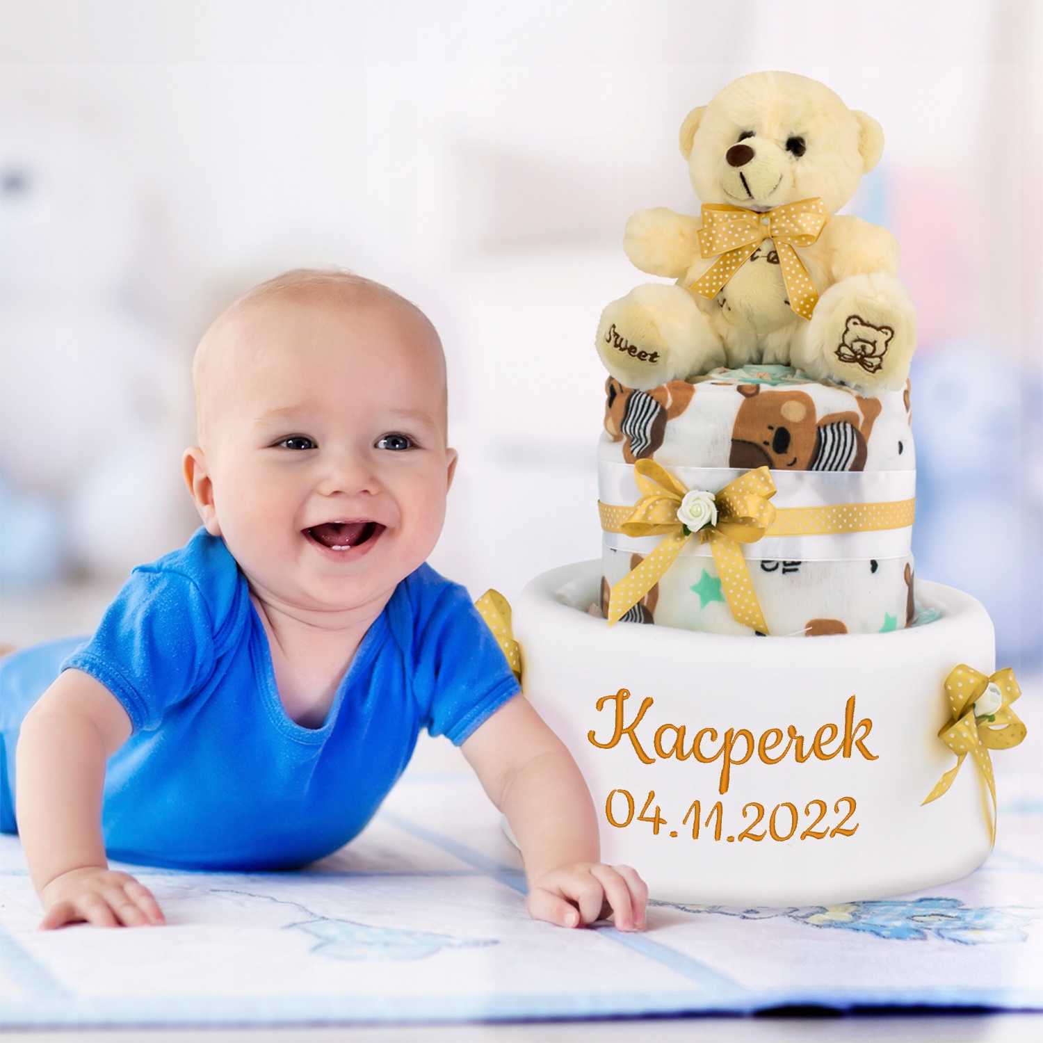 Уникальный торт для малыша, включающий в себя пледик, мягкую игрушку и подгузники - чрезвычайно практичный подарок на крещение день рождения ребенка или детский праздник. Подгузники располагаются по кругу, завернутые в плед и украшенные атласной лентой. Талисман изготовлен из высококачественного плюша, что обеспечивает безопасную игру и позволяет тренировать двигательные и мануальные навыки ребенка (хватание, перекладывание и т. д.). Разнообразие цветов и структур учит детей различать их и влияет на положительное развитие ребенка.