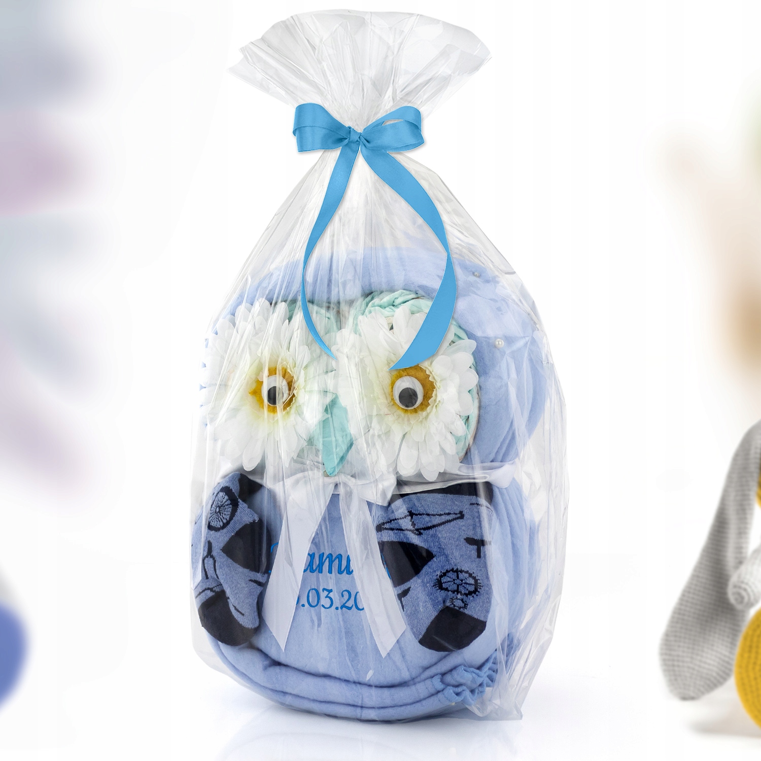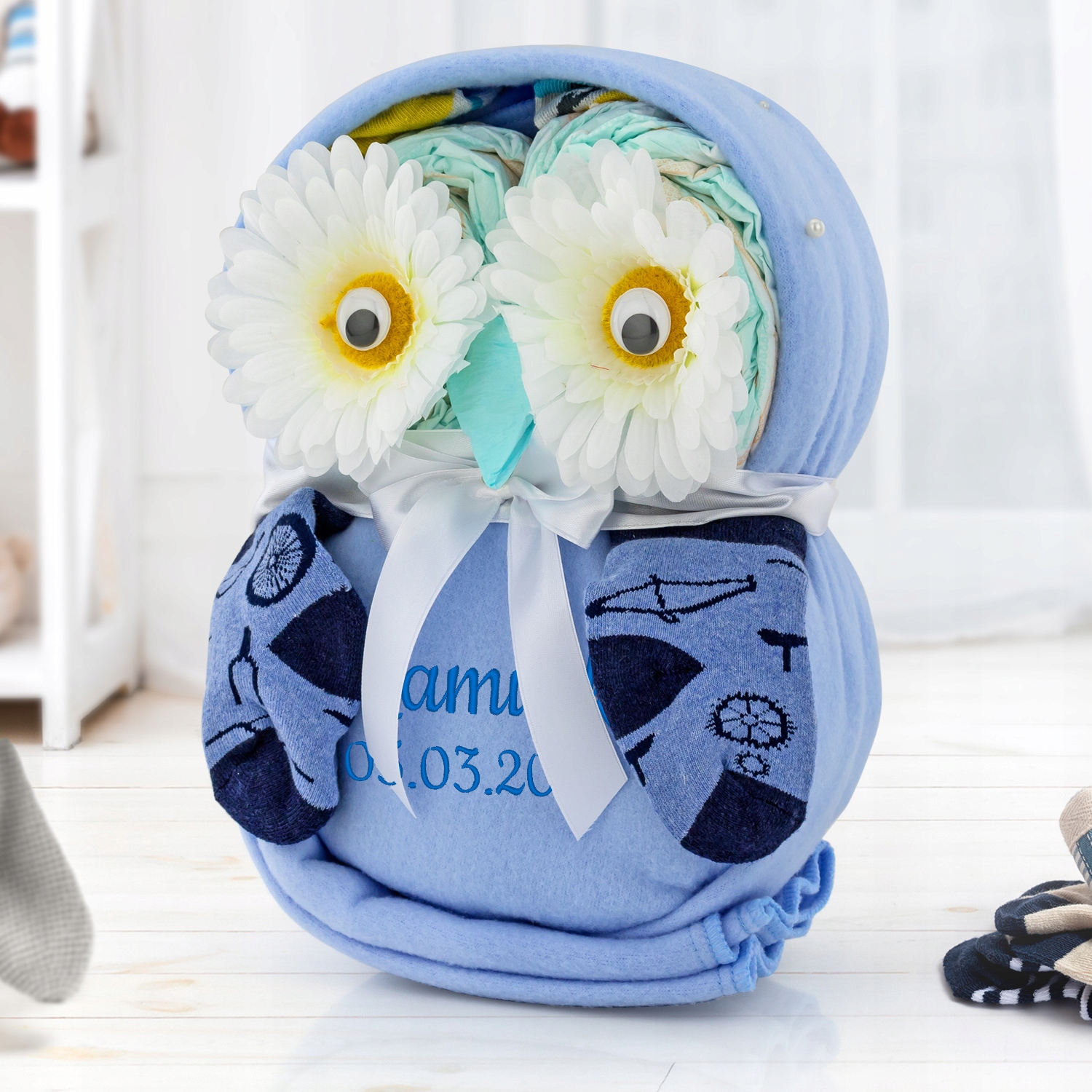 Уникальный детский торт в виде милой совы – чрезвычайно практичный подарок на крещение > или день рождения ребенка. В него входят одеяло, носки и фирменные подгузники. Мы предлагаем разместить на пледе индивидуальную вышивку, которая сделает подарок неповторимым. Гениальная сова непременно понравится родителям малыша, ведь в ее состав входят самые желанные при рождении ребенка предметы.