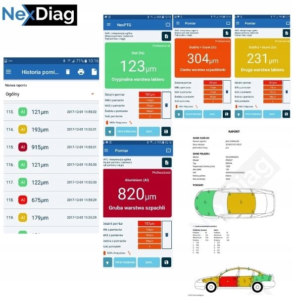 Профессиональный измеритель краски NEXDIAG имеет множество преимуществ. Сюда входит возможность создавать отчеты и руководство по покупкам, в котором предлагается, что следует проверить перед покупкой подержанного автомобиля.