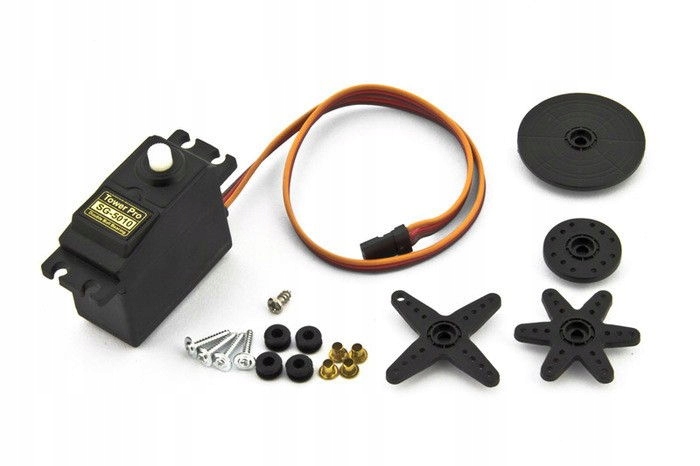 Прочный, как для сервопривода «стандартного» типа, двухопорный Tower Pro SG 5010. В комплект также входит набор из 4-х разных Т-образных стержней с резиновыми лентами и крепежными винтами. Сервомодель, используемая в моделировании, робототехнике, приводных конструкциях, системах сигнализации.
