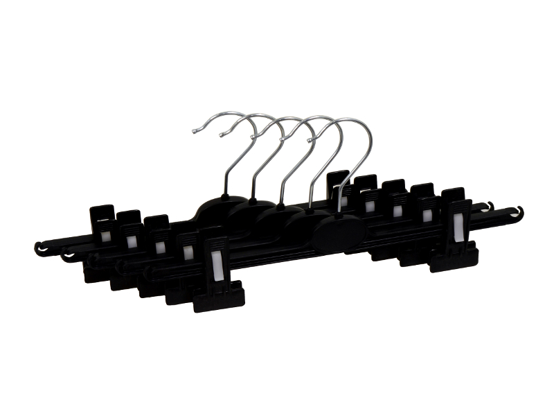 Вешалка-зажим, также называемая вешалкой для юбок, общей длиной около 32 см. Зажимы имеют очень сильное давление, что позволяет надежно удерживать одежду на вешалке. Под пряжками имеются резиновые накладки, которые не позволяют одежде повредиться или соскользнуть с вешалки. На концах вешалки имеются специальные выемки, облегчающие развешивание одежды.